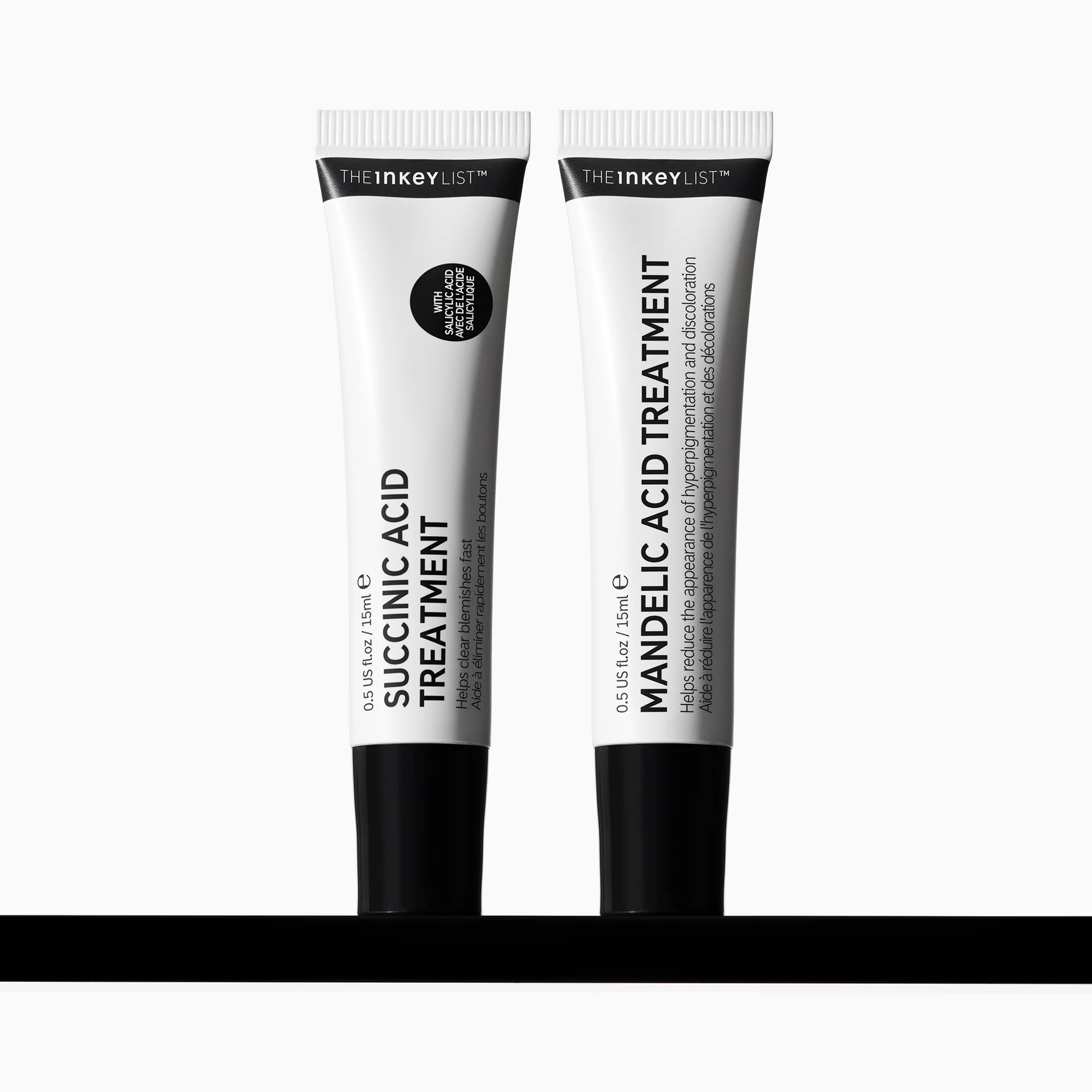 Succinic Acid Treatment (a fast acting blemish target treatment that works to reduce inflammation) and Mandelic Acid Treatment (proven to significantly fade the appearance of hyperpigmentation, dark spots and post acne marks).
